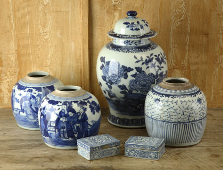 blue painted with bold chrysanthemums on rockwork, 43cm high; and other 19th century Chinese blue painted wares, comprising: a pair of ginger jars with figural decoration, 20cm high; another ginger jar with abstract and geometric decoration, 23cm high; a rectangular footed dish decorated with good luck symbols, 23.5cm diameter; a lobed oval dish decorated with flowers and foliage, 24cm wide; and two foliate decorated boxes and covers, one 12.5cm wide, the other 12cm wide; and a blue painted rectangular footed dish with everted diaper decorated rim, the sides decorated with scrolling foliage, 23cm wide (8)