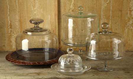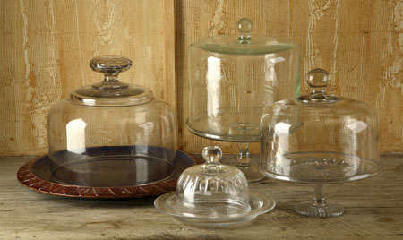 on a pottery plate with foliate border, 44cm diameter; another plain moulded glass cake stand with associated cover; another, similar, smaller, with associated cover; and a star cut circular plate with thumb cut cover (4)