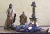 of a beggar man, 48cm high; an 18th century carved wood and painted figure of a religious figure on shaped wooden plinth, 40cm high, another 18th century giltwood figure, on open carved plinth, 40cm high and a 19th century carved alabaster figure of St Peter, on stepped base, 25cm high (4)