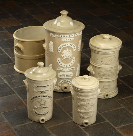 with moulded fern and scroll decoration and with the Royal coat-of-arms, ‘Barstow’s Patent, natural stone and carbon water filter, awarded 36 gold medals and 1st prize, Ferrybridge’; three smaller, one by G Heaving, two by Black & Brownlow; and an oval stoneware trough (5)