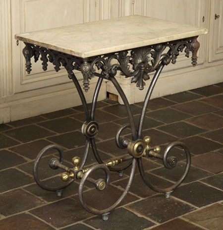 the veined white marble top above a pierced acanthus cast frieze, on scrolling legs joined by stretchers