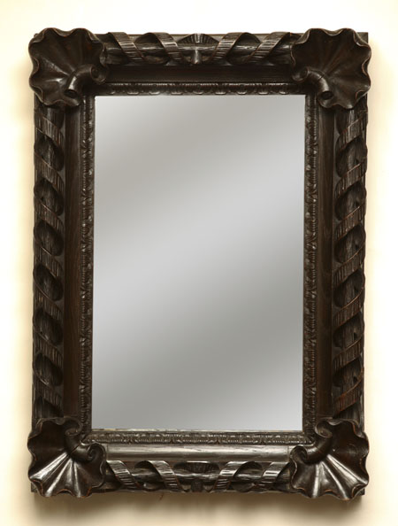 the rectangular mirror plate in acanthus carved slip and spiral ribbon carved frame with shell carved corners