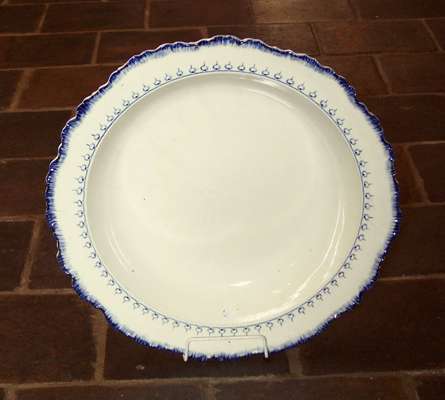with flared scalloped rim decorated with blue line decoration and stylised flowerheads, impressed mark