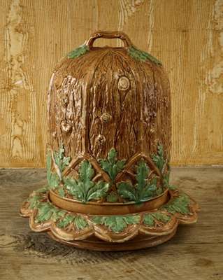 A 19th century English majolica cheese bell and stand