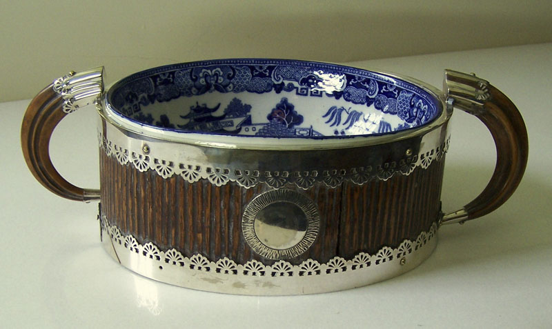 An Edwardian oak and plate mounted twin handled oval server