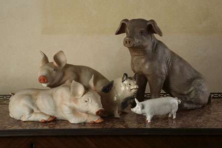 with black spots; an Austrian painted terracotta seated pig, 30cm high; a Beswick pig ‘Ch Wall Champion Boy’, 17cm wide; two modern ceramic pigs (one damaged); and a small brass pig pin cushion (lacking cushion) (6)