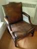the arched padded back, downswept arms and shaped seat, on square legs joined by an H-stretcher