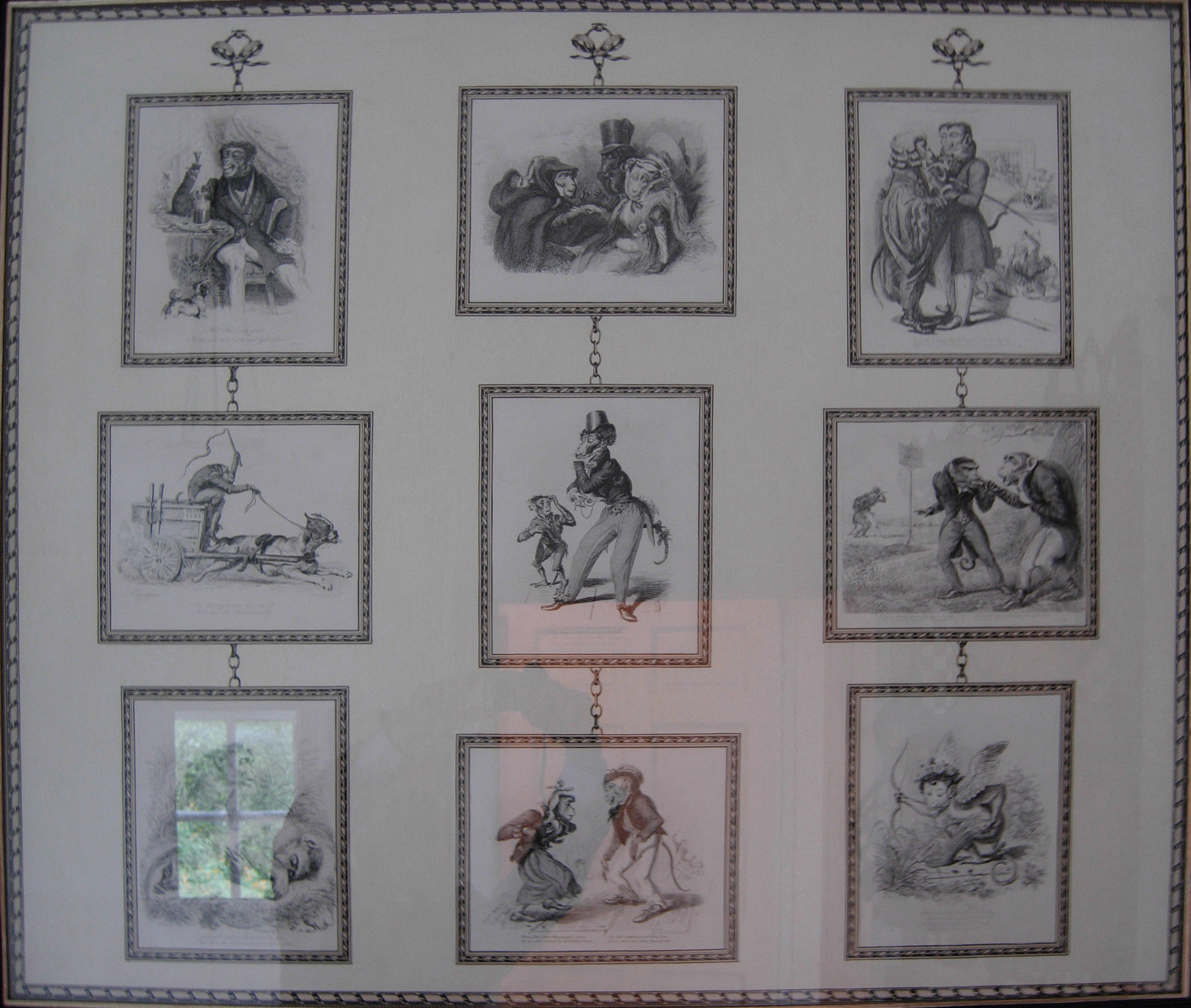 A framed group of nine amusing monkey prints