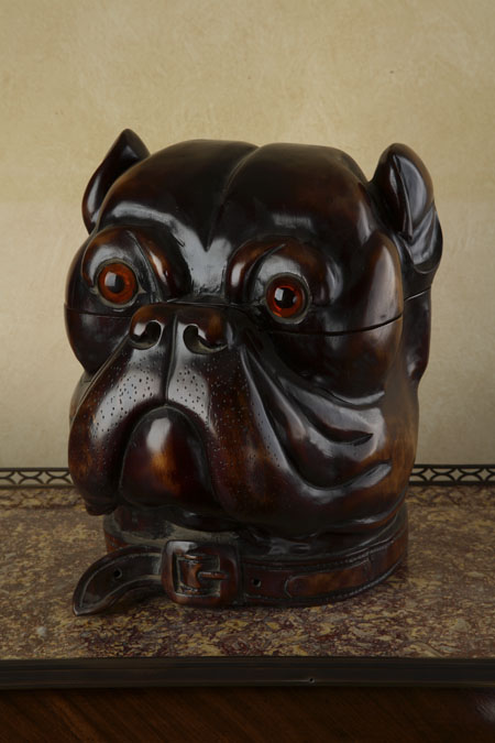 of Victorian style, in the form of a pug’s head, the hinged head revealing a void interior, with inset eyes and carved collar