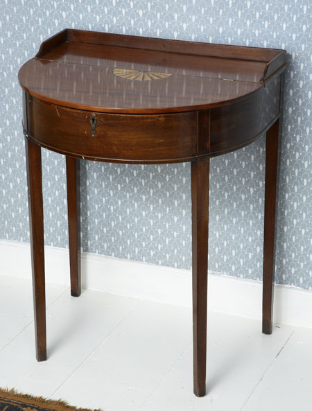 the hinged D-shaped top with batwing inlay and three quarter gallery, enclosing a fitted interior, above plain frieze, on square tapering legs