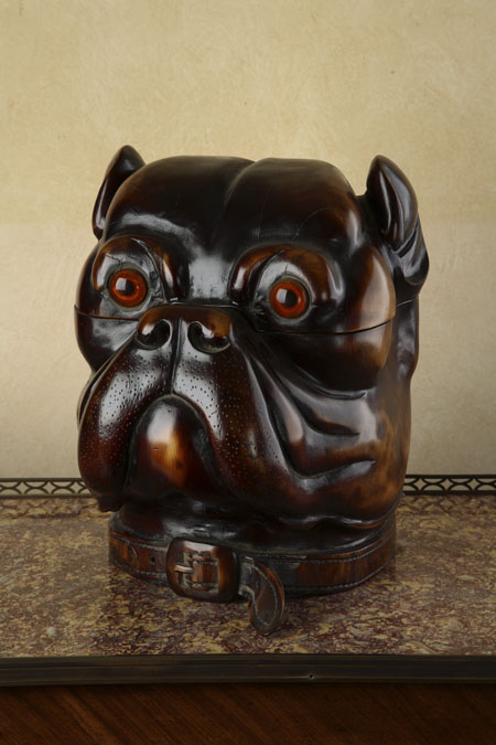 of Victorian style, in the form of a pug’s head the hinged head revealing a void interior, with inset eyes and carved collar