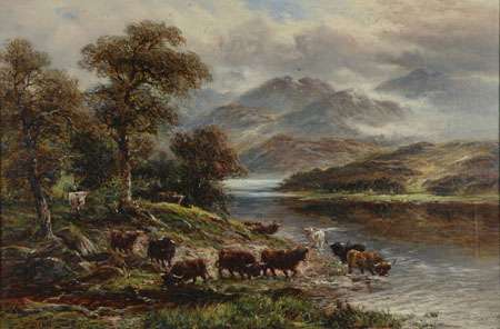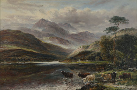 HIGHLAND CATTLE WATERING BY A MOUNTAIN LOCH