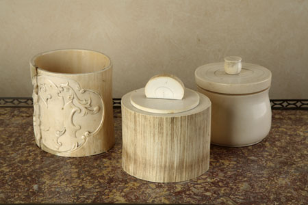 with a foliate cartouche carved panel, 14cm high; an ivory lidded box, 15cm high; and a bulbous ivory container, 13cm high (3)