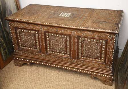 the moulded rectangular hinged lid with central chequer inlaid panel, above a moulded triple panelled front, on moulded base with bracket feet
