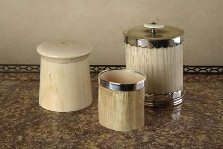 with oval lid and lined interior, underside marked, ‘Mappin and Webb’s Prince’s Plate’, 15cm high; a turned ivory cylindrical box, with domed screw top lid, 12cm high; and a small ivory and silver mounted beaker, 9cm high (3)