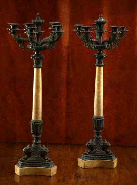 each with petal shaped nozzle supported by corucopia, mounted on griffin paw supports and triform base (2)