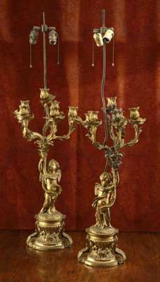 each in the form of cherubs upholding torches with six foliate scroll candlearms and leafy nozzles, the waisted fluted socles with vine and berry swags and acanthus leaf scroll sides (wired for electricity) (2)