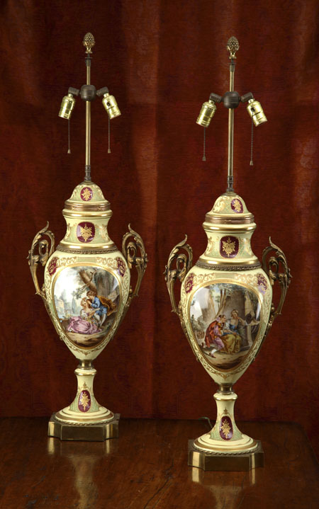 converted to lamps, each of baluster form, and with giltmetal scroll handles and mounts, decorated with red painted oval panels decorated with gilt rose sprigs, between green borders decorated with gilt trellis work and gilt scrolling, against a pale yellow background, with opposed oval painted panels, one side with a courting couple, the other with a landscape scene (2)