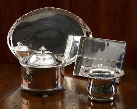 with pierced handles and shaped sides, engraved with entwined foliate scrolls, rear with marks, 51cm long; a silver plated wine bottle stand, of bulbous form, 23cm diameter; a silver plated tureen, with domed lid and lion mask ring handles, underside marked, 25cm diameter; and a silver plated wafer box, initialled 'DB', 29cm long (4)