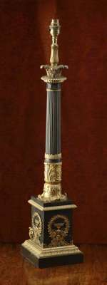 of Empire style, the reeded tapered column ending in an acanthus collar, the square pedestal with applied urn and wreath mounts, on a square lotus leaf decorated plinth