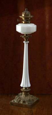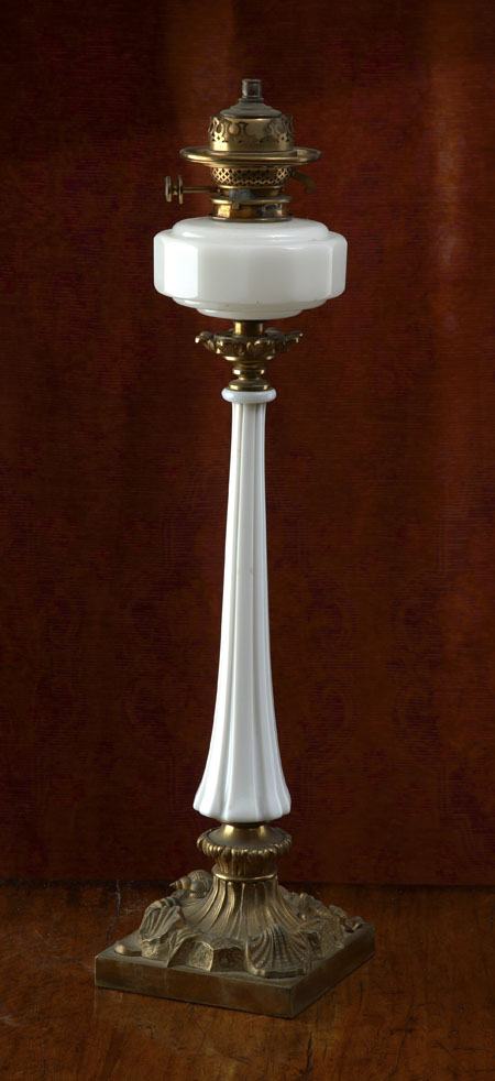 adapted for electricity, the burner, marked 'Hinks and Son', on a fluted flared stem ending in a shell cast base with square plinth