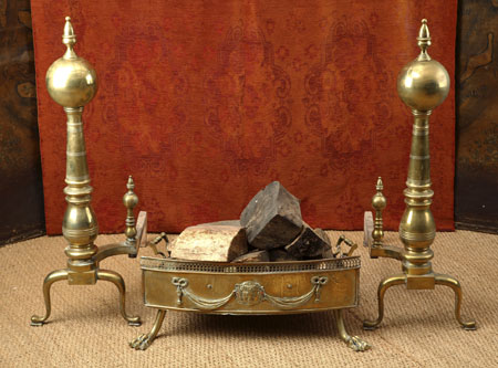 each with acorn and large ball finial on plain tapered stem ending in cabriole legs, 95cm high; and a brass and steel fire ash box, the central mask flanked by swags, on hairy paw feet, 67cm wide (3)
