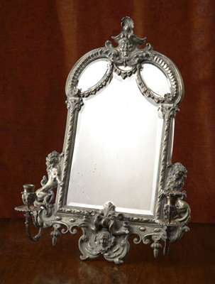 of Baroque style, the central bevelled plate below two upper oval margin plates and central mask cresting, the apron with a central mask, serpents and rampant lions and candlearms to the sides, rear with strut