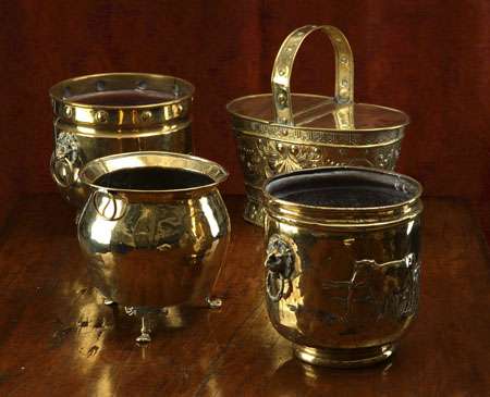 with loop handle and twin lidded top, the sides decorated with scroll work and large shells, 36cm long; an early 20th century circular brass jardinière, embossed with a village scene, 24cm diameter; a 19th century brass jardinière, 24cm diameter; and an Edwardian lobed brass jardinière, 26cm diameter (4)