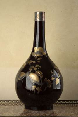with dark sang-de-boeuf ground, silver plated mount to the neck, and later applied lacquer birds, flowers and foliage