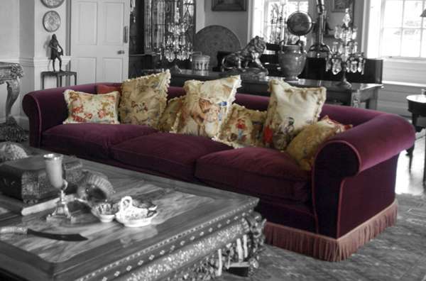 in the manner of Colefax & Fowler, each with outscrolled back and armrests and seat covered in purple velvet fabric, with cord edging and tasselled base, fitted with casters (2)
