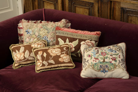 44cm long; with two smaller similar examples, 35cm long; and two further floral tapestry cushions (5)