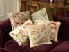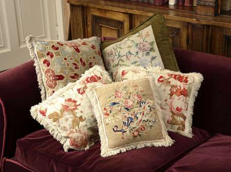 tasselled, of interwoven foliate design, 52cm long; and a large geometric tapestry cushion, 57cm; and two further needlework cushions (5)