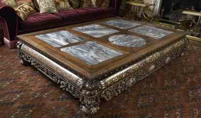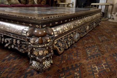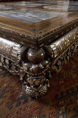 the divisioned rectangular top inset with six shaped grey marble panels, the front and sides with frieze and pierced apron inlaid with scenes, foliate and other decoration in mother-of-pearl, the front apron with further smaller marble panels, on lion’s head carved legs and ball feet