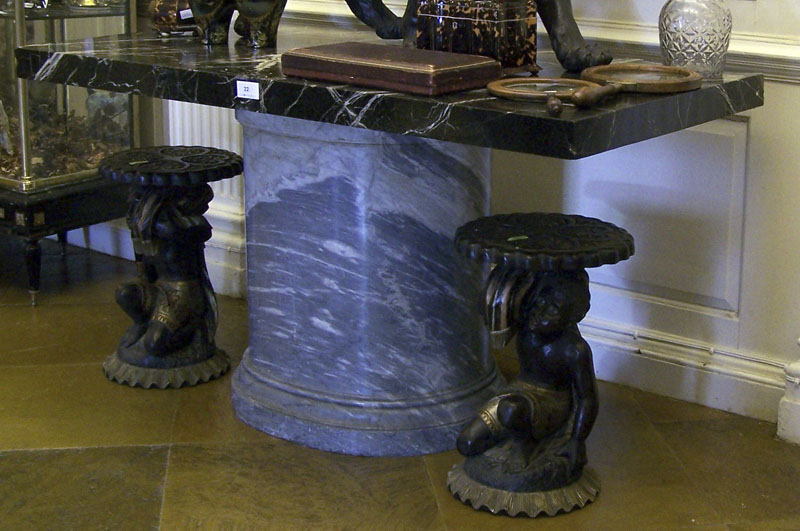 the white veined black rectangular marble top on grey marble oval section column with carved plinth base