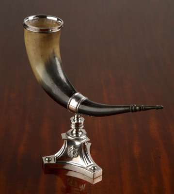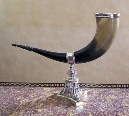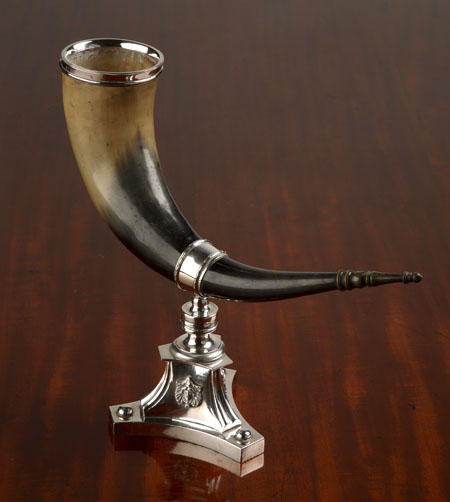 modelled as a curved horn cornucopia, raised on a silver plated circular and triform flared base, applied mask detail, plinth base