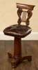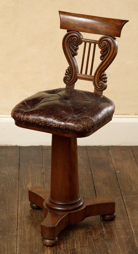 the tablet toprail above pierced scrolled lyre back, the button upholstered leather seat swivelling and rising on turned column and tripartite base with bun feet