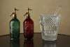 one flashed red and one green, a circular form diamond cut wine cooler; with glass ladle; and another glass ladle (5)
