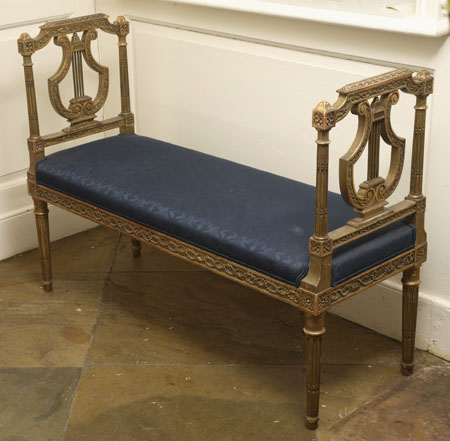 of Louis XVI style, the ends with leafy vine carved toprail above pierced lyre splats between stop fluted turned columns, the rectangular seat covered in navy blue fabric, above leafy vine carved frieze, on stop fluted turned tapering legs