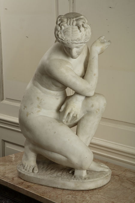 A 19th century carved white marble figure of The Crouching Venus, after the Antique