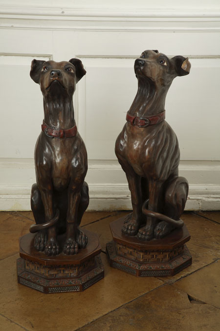 each seated, each with head raised and wearing a red collar, the stepped octagonal base with basket weave and foliate carving (2)