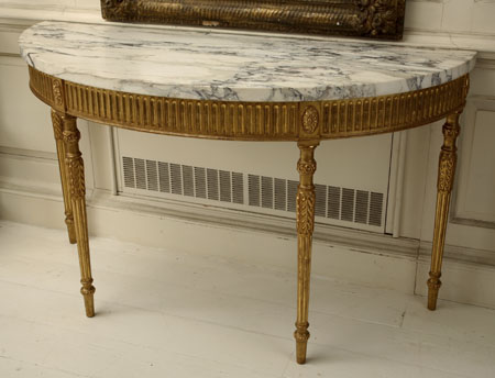 A pair of marble topped giltwood demi lune side tables