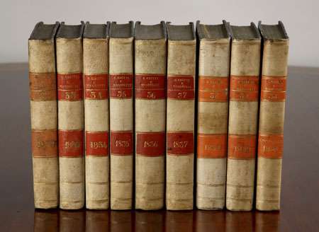 Raccolta de regi, editti, proclami, manifesti ed altri provvedimenti de magistrati ed Uffizi. Turin, 1814-60, 57 volumes including supplements, 8vo, contemporary vellum-backed boards, orange morocco labels, spines gilt, some spines lightly dust-soiled, one head of spine worn (57)