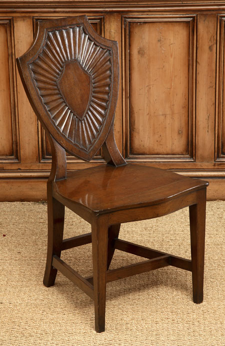 the shield shaped back with inner shield tablet and radiating fluting, the solid serpentine seat on square tapering legs joined by an H-stretcher