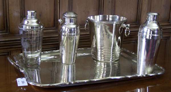 with ring handles, inscribed ‘Carton’, 20cm high; an etched glass and plated cocktail shaker; two further plated cocktail shakers; and a twin handled tray, 65cm wide (5)