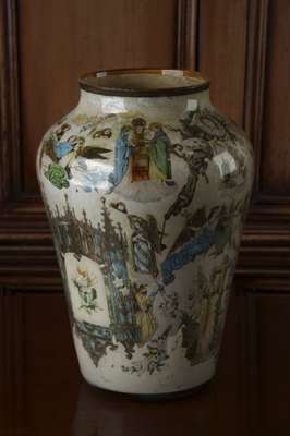 of tapering cylindrical form, with narrow neck, decorated with opposed gothic panels and figures of angels and saints on a cream painted ground