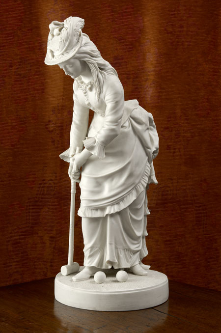 playing croquet, on a circular plinth, impressed mark ‘Copyright reserved Copeland M80’ and ‘EA Morris SC’ (restorations)