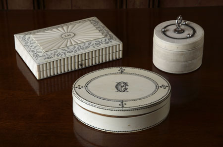 the lid with central oval inscribed ‘I N’ and enclosed within radial veneers and an outer arabesque band, with lobed sides, 19cm wide, 13cm deep; an early 19th century Vizagapatam oval box, with engraved central monogram to removable lid, 18cm long; and a 19th century Indian ivory cylindrical lidded box, with silvered mounts, 10cm diameter (3)
