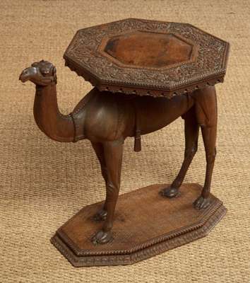 the octagonal top with wide fruiting scrolling foliate carved border, supported on the back of a naturalistically carved camel, standing on elongated octagonal plinth base