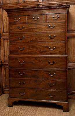 the moulded cornice with Greek key pattern above a plain frieze, over three short and three long graduated drawers, the lower section with secretaire drawer, enclosing an interior fitted with drawers and pigeon holes, above three long graduated drawers, on bracket feet