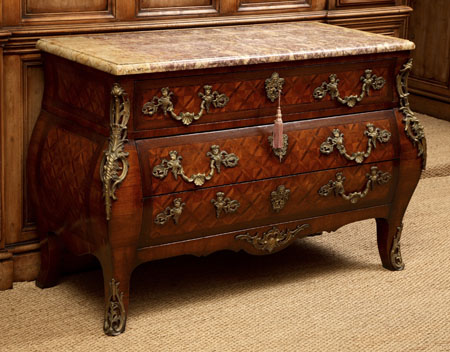 A French marble topped, kingwood parquetry and brass mounted bombe commode